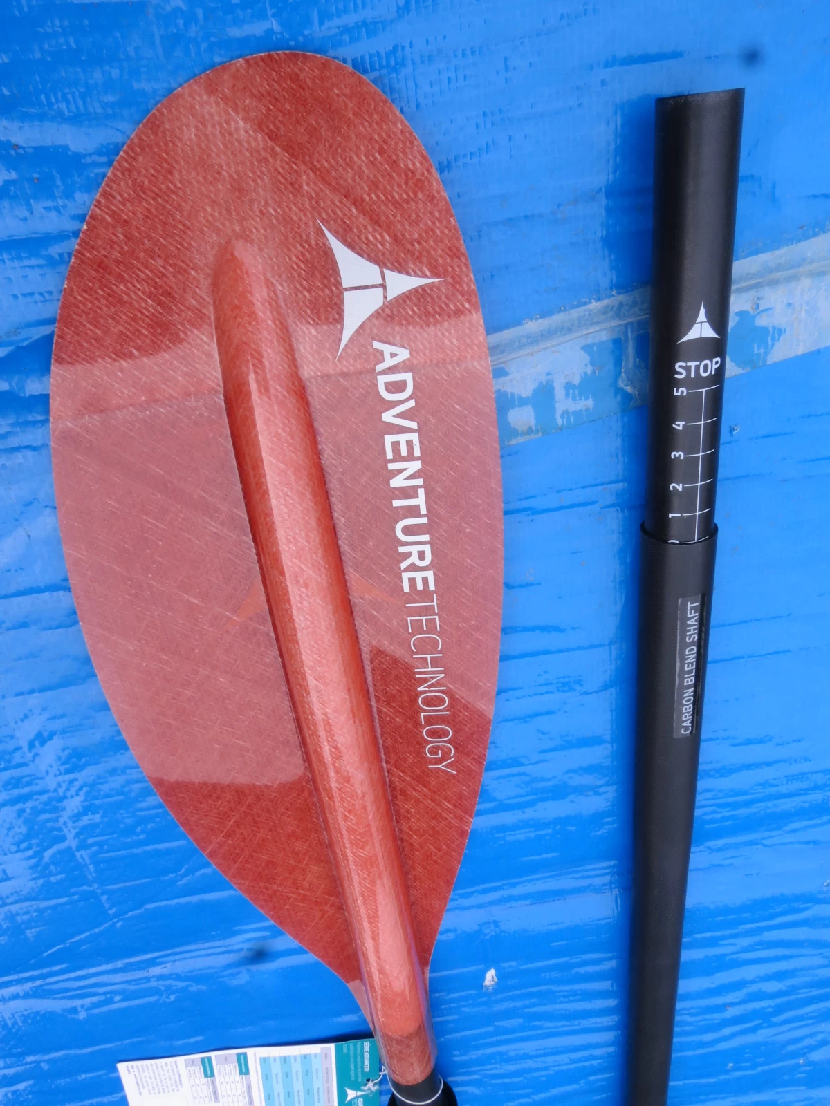 Aus dem Hause Adventure Technology kommt das leichte, sehr hochwertige AT Odyssey Kajak Wanderpaddel. Ein verstärktes Glasfaserblatt, Carbon Blend Schaft und Vario Pro- Teilung. Das Paddel ist bei Bedarf um ca. 5 cm verlängerbar und im Winkel stufenlost einstellbar. Der gummierte Schaft ist auch an kalten Tagen mit nassen Händen sehr angenehm zu greifen. Gewicht ca. 825 g.