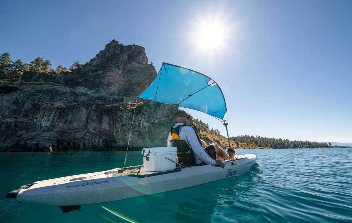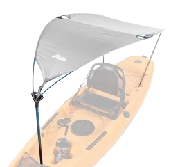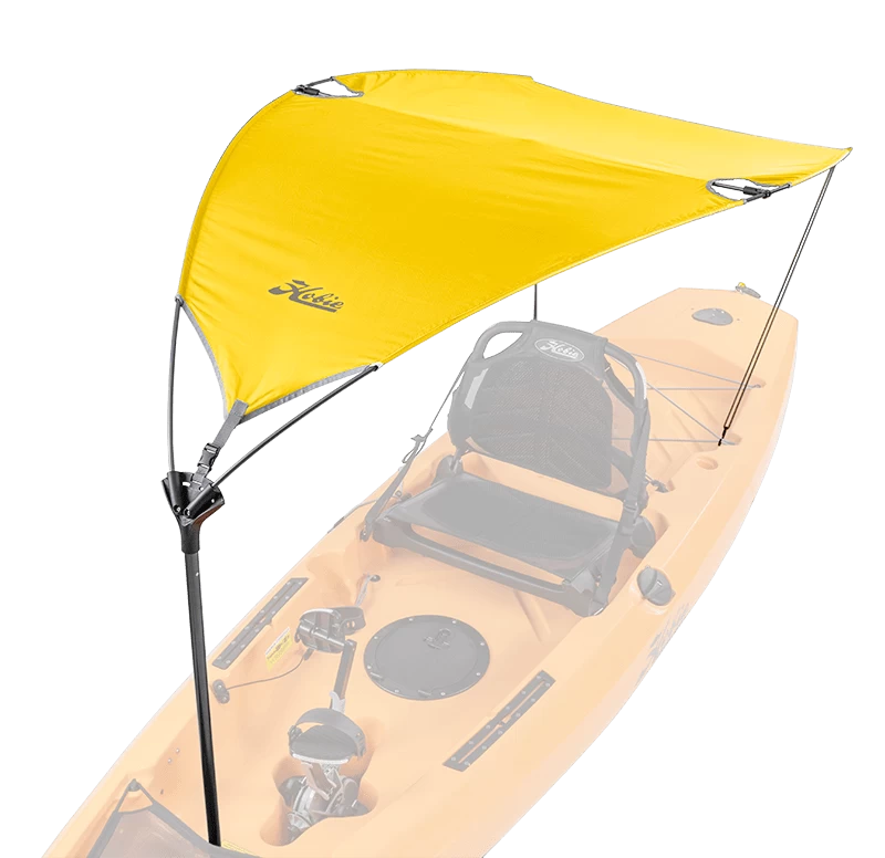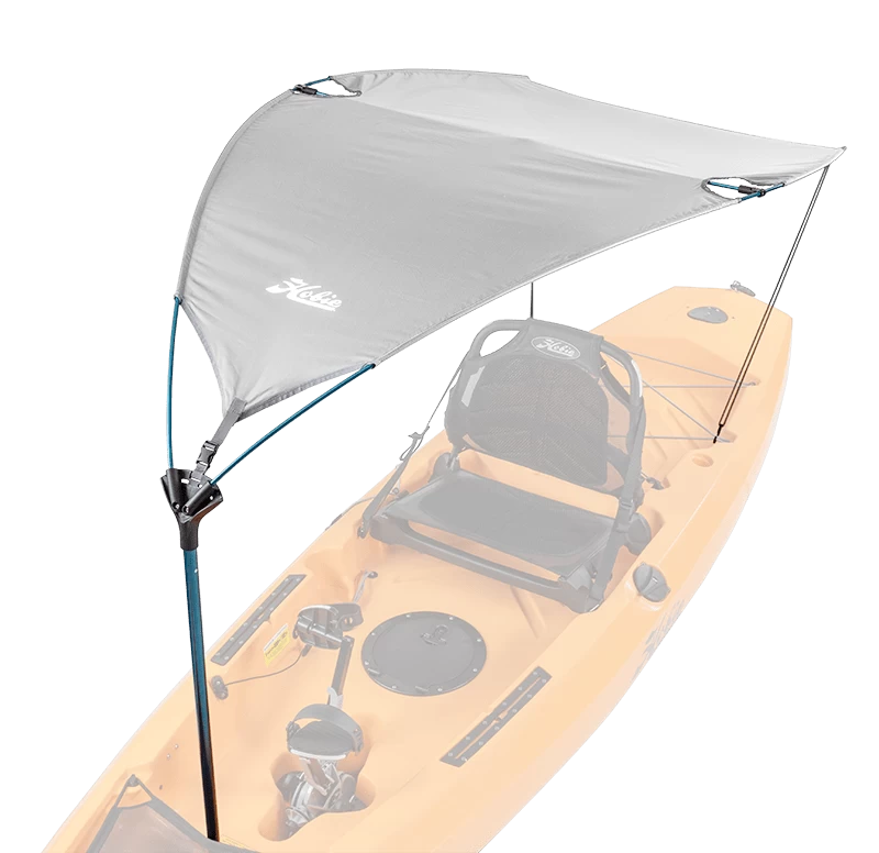 Gerade auf dem Wasser wird die UV- Belastung oft unterschätzt. Dass sinnvolle Sonnensegel, Hobie Bimini ist ein genialer Sonnenschutz, passend für fast alle Hobie Festrumpfkajaks (außer Tandem Island und Adventure Island).