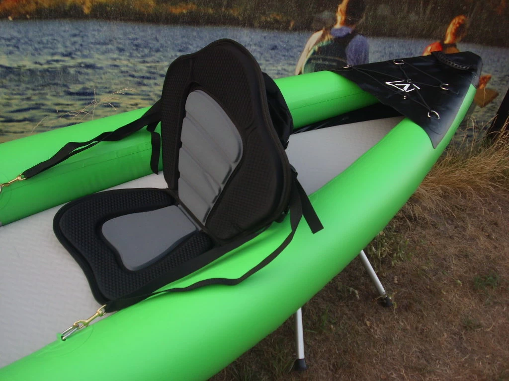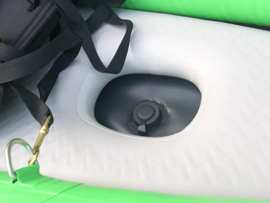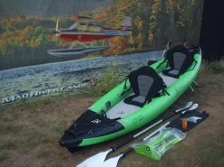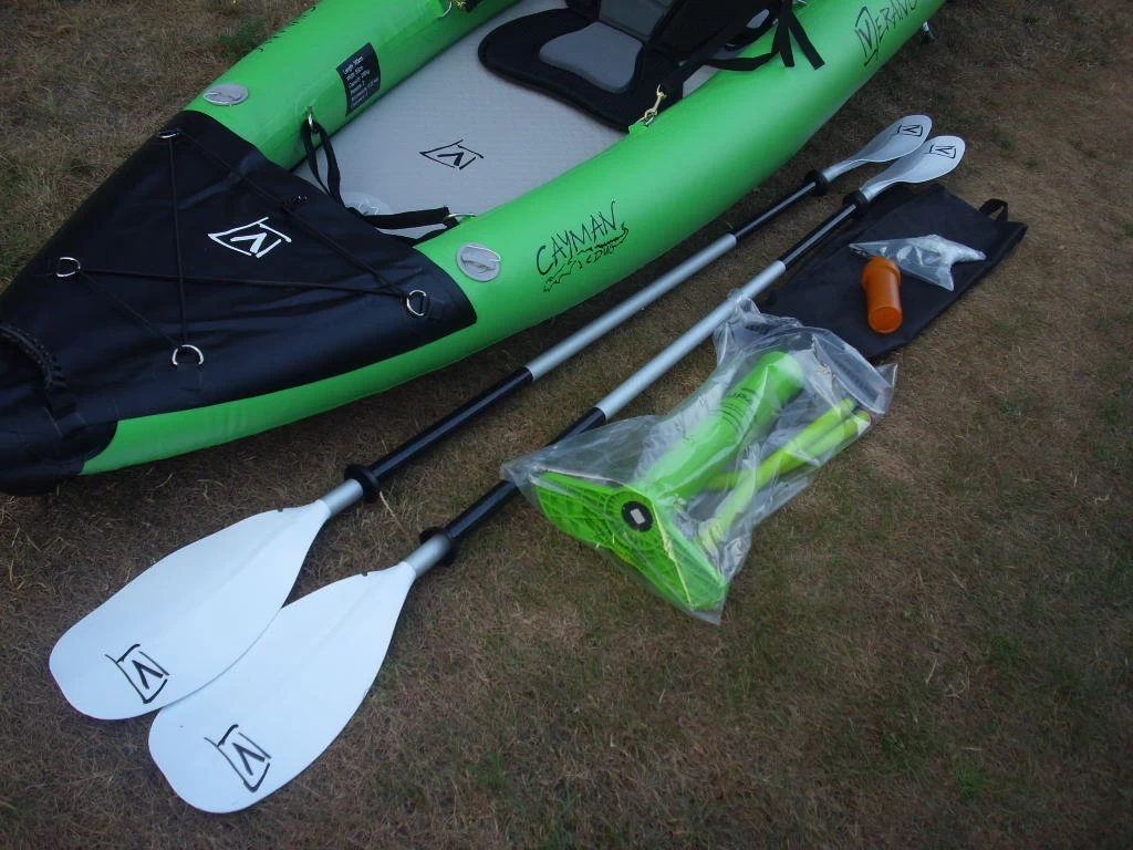 Das Verano Cayman Duo Set besteht aus einem aufblasbarem Kajak mit Paddel, Boatbag, Pumpe, Reparaturset und Finne.