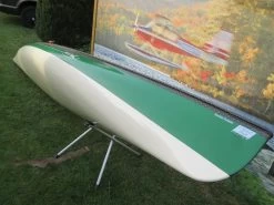 Hier in robuster Kevlar Fusion Bauweise, Keflar/Carbon Süllrand, Gurtbandsitz mit Kontur + Ausstattung in Kirsche. Farbe Kevlar emerald (grün), Unterschiff Gelcoat champagne.