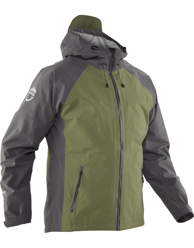 Super bequeme und leichte Outdoor- und Paddeljacke für Angler und Paddler von NRS! Farbe olive/dark schadow. Champions Jacket – Paddeljacke für Angler, effektiver Schutz vor Wind und Wetter. Wasserdicht und atmungsaktiv. Funktionelles NRS Design.