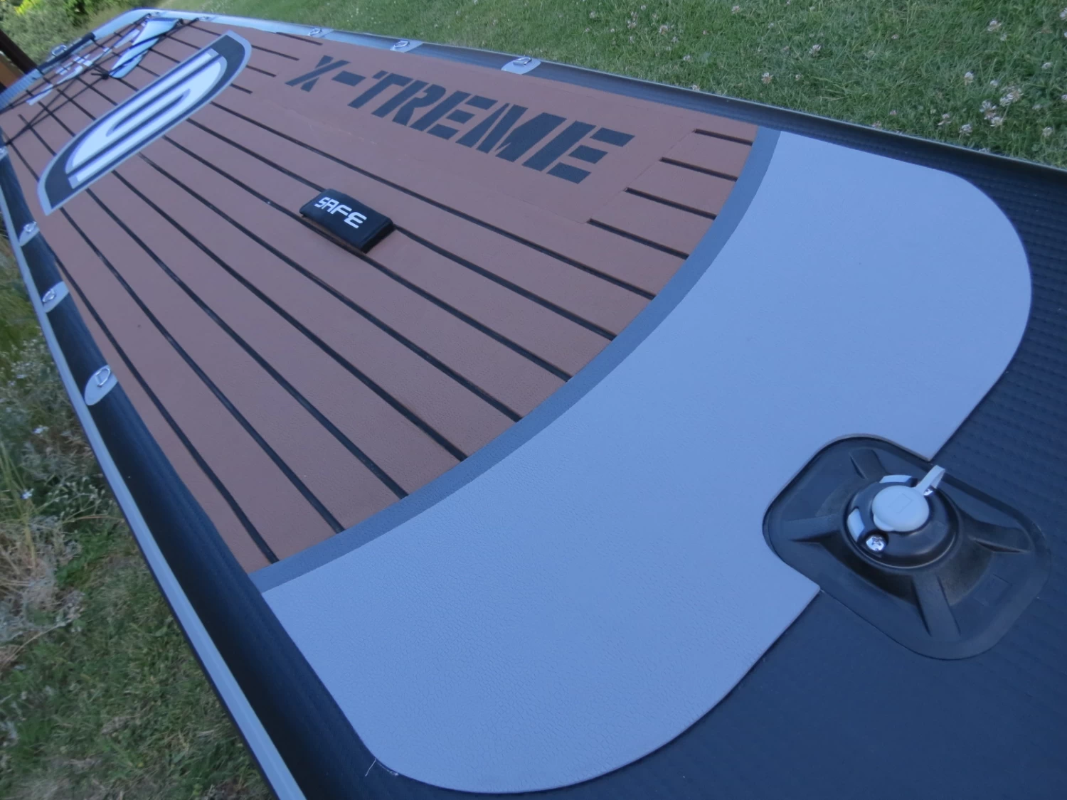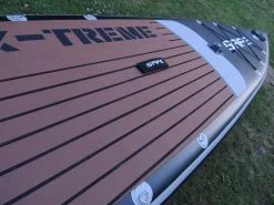 Das X-TREME 14, das ultimative Touring- und Expeditions- Board mit viel Platz für diverses Equipment. Das X-Treme 14 ’ist das aufblasbare Sup, das für lange Strecken, kleine und große Abenteuer entwickelt wurde. Gerade auch größere und schwere Paddler fühlen sich gleich sicher und gut aufgehoben. Die extrem robuste Bauweise ermöglicht auch einen Einsatz auf Gewässern mit Steinen, Baumstämmen usw.. Nicht nur seine große Stabilität und hohe Zuladung machen das X-TREME 14 so beliebt. Es ist auch sehr schnell und leichtläufig. Auch als Tandem Board oder als Badeplattform für die ganze Familie lässt sich das X-TREME 14 gut nutzen. Diverse D-Ringe bieten Befestigungsmöglichkeiten zum sicheren verzurren von diverser Ausrüstung, Angelgeräte und Zubehör. Das Deck Pad dient auch als bequeme Schlafplattform und ist für die Unterbringung eines Biwaks beim Campen für die Nacht ausgelegt. Die vorderen und hinteren robusten Griffe vereinfachen den Transport.