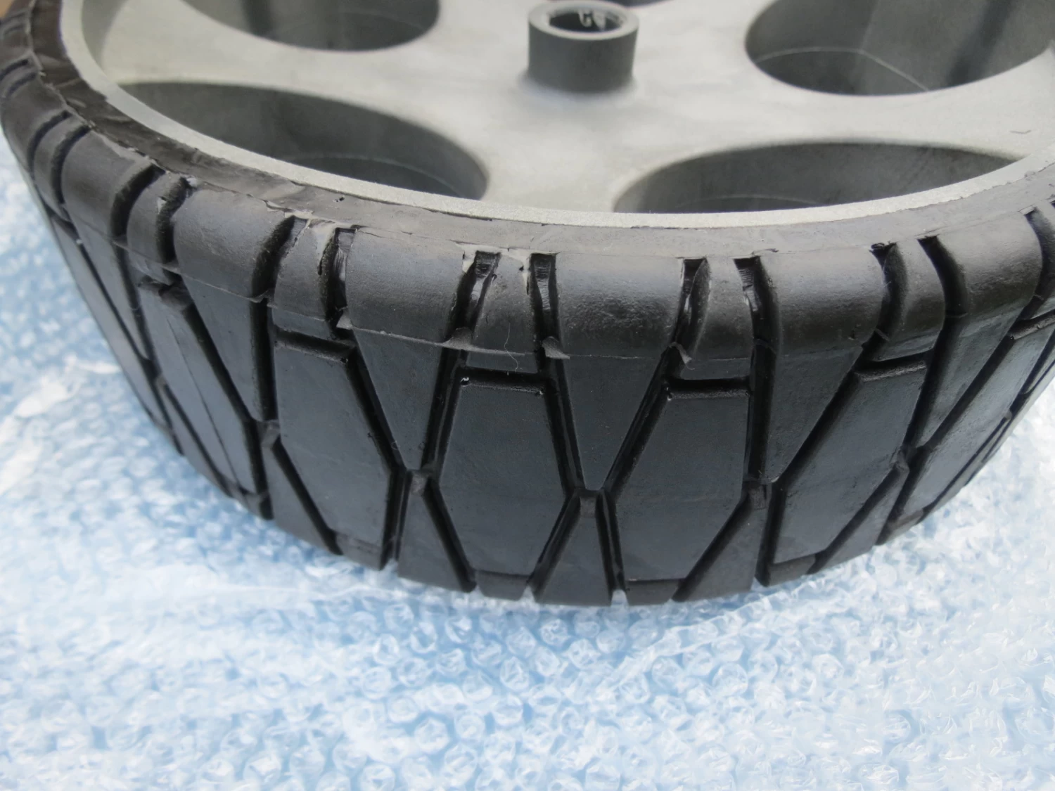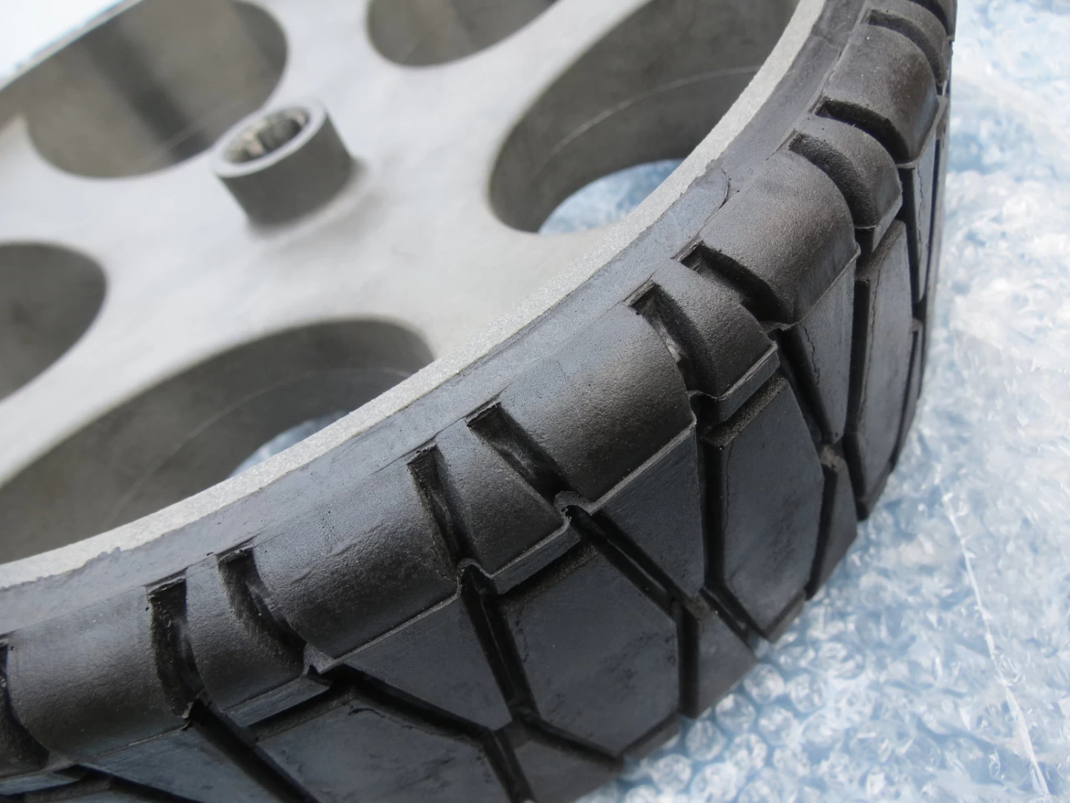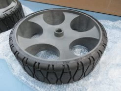Große Vollgummi-Räder mit einem Durchmesser von 30 cm und ca. 9 cm Breite rollen reibungslos über unebenes Gelände.
